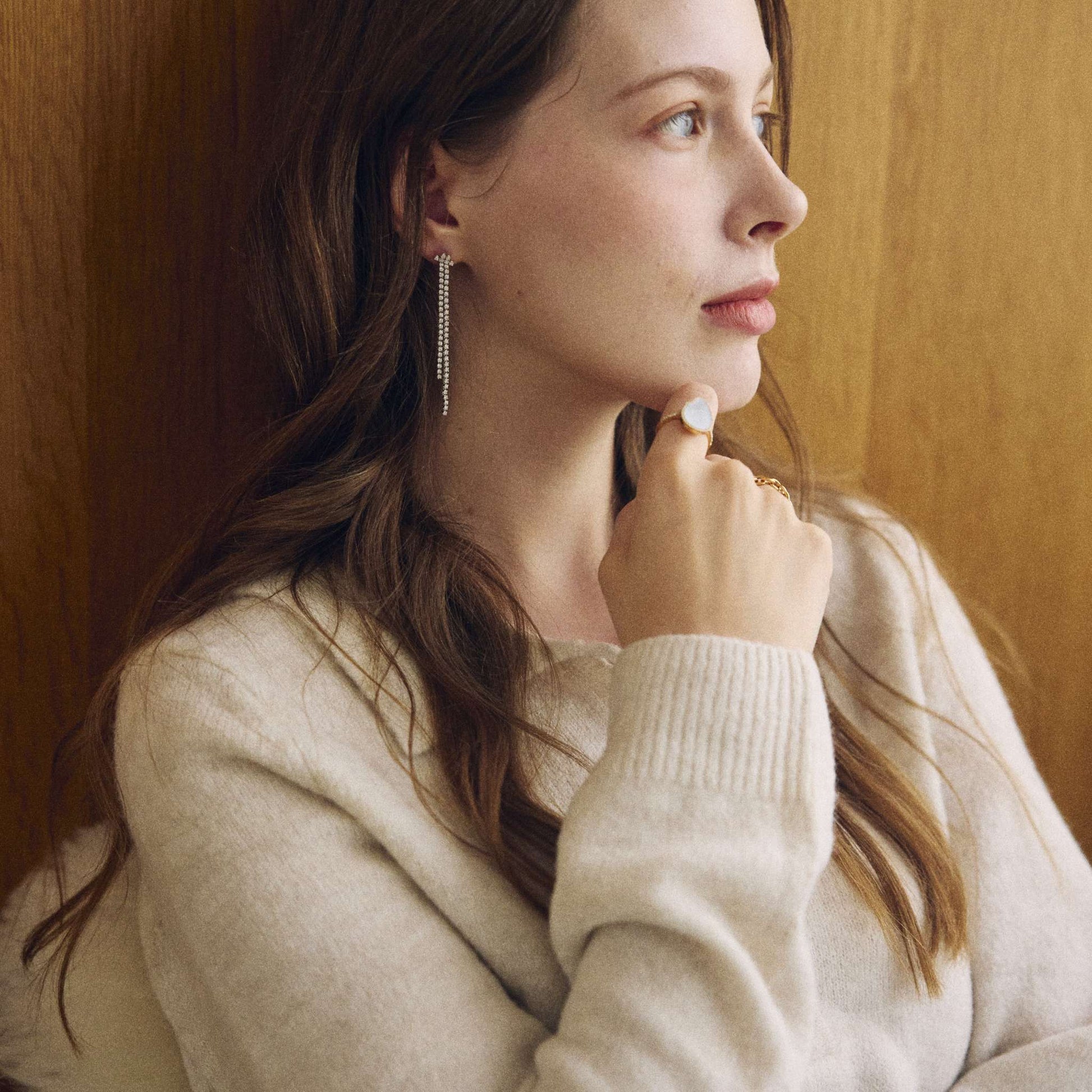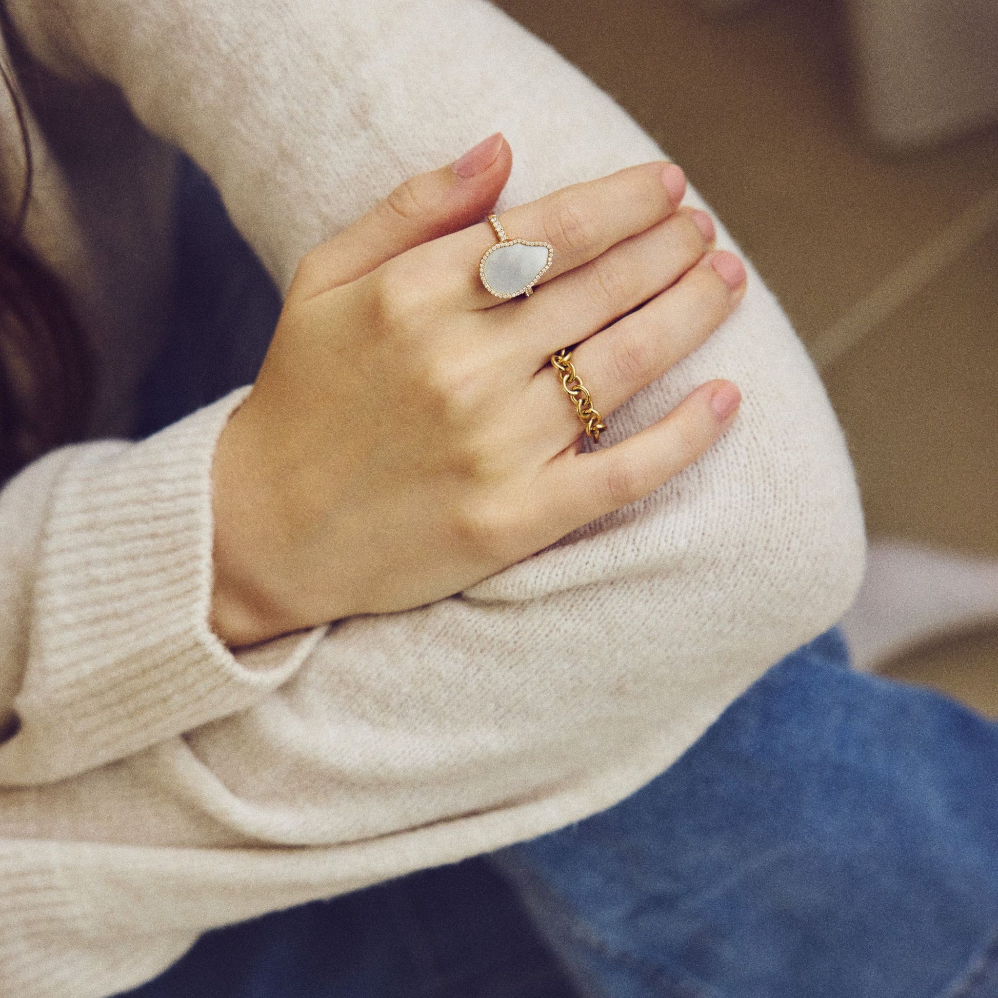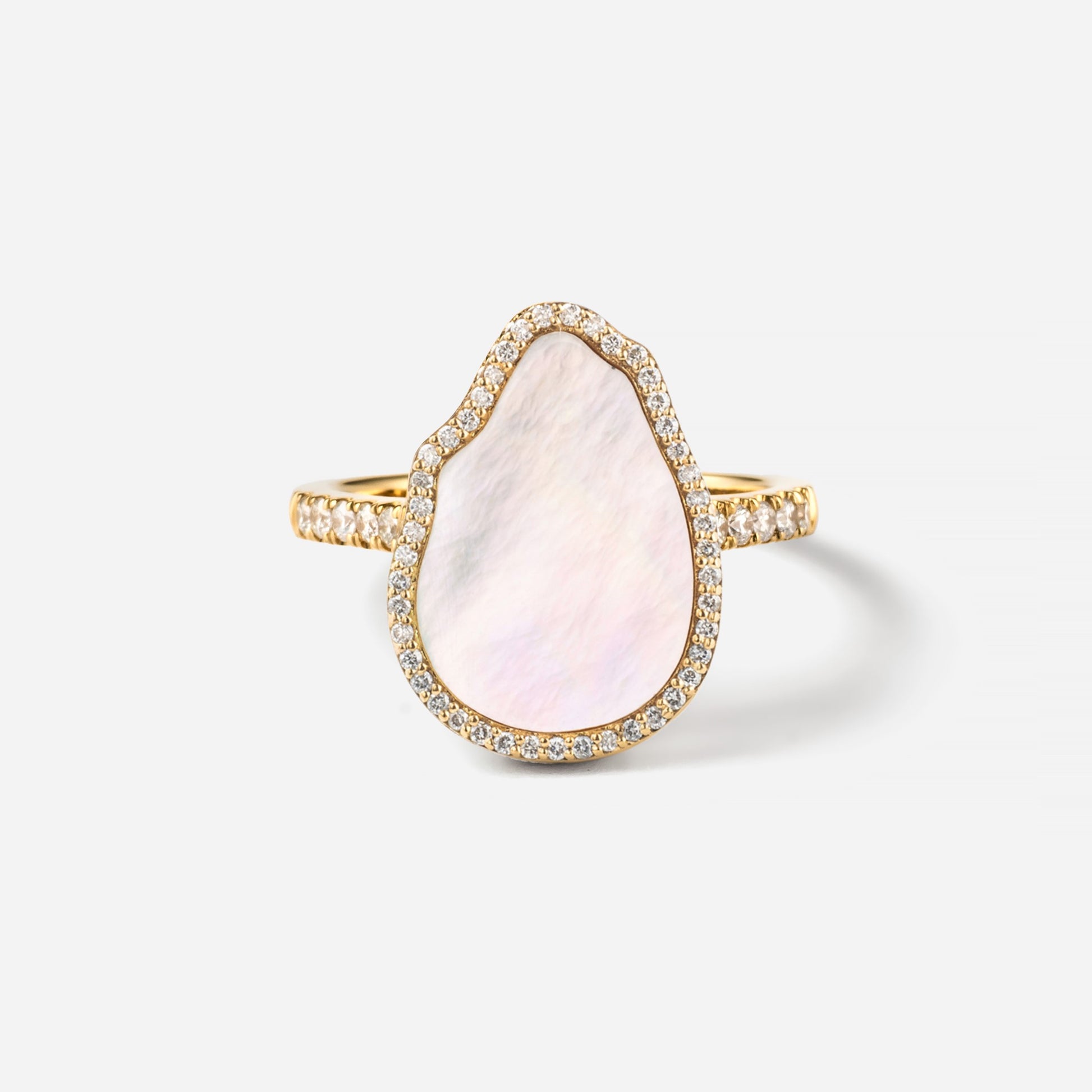 オイスターのような輪郭のバロックパールのシルエットを、マザーオブパールを用いて2次元のアウトラインとして再現。