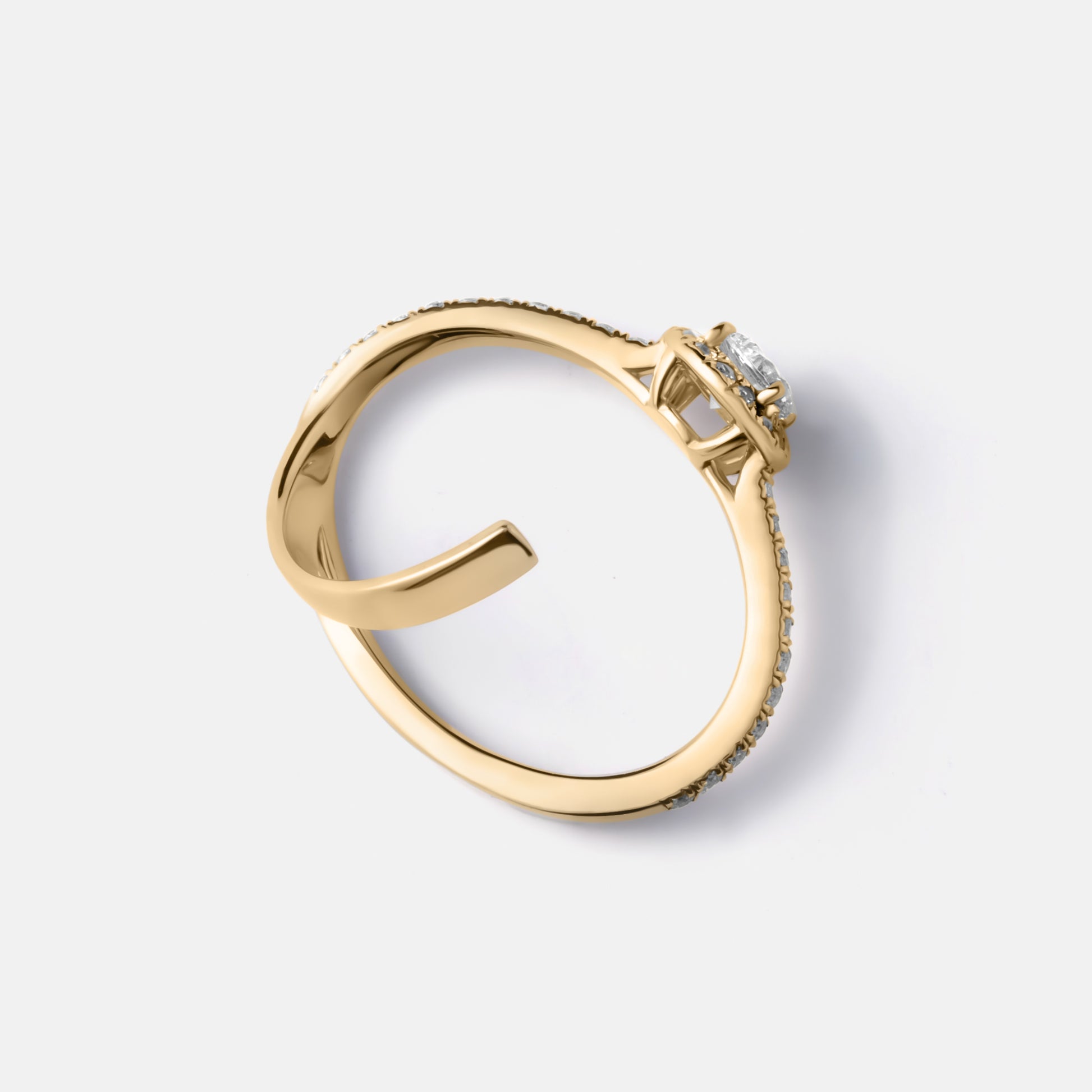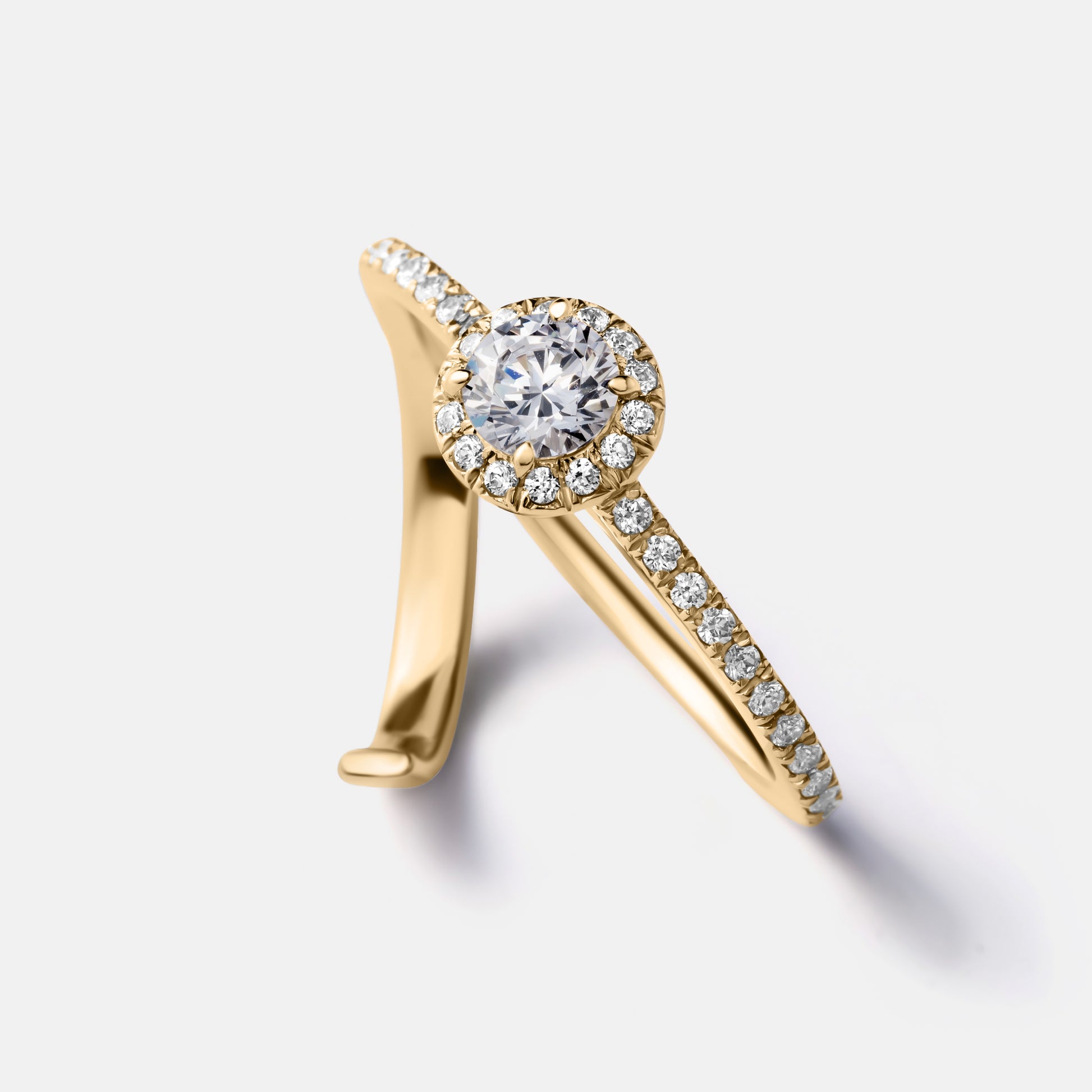 センターダイヤの周りにメレダイヤモンドを取り巻いたデザインで、婚約指輪としても人気であるヘイローリングをベースに生まれた、diamond slash halo ring。