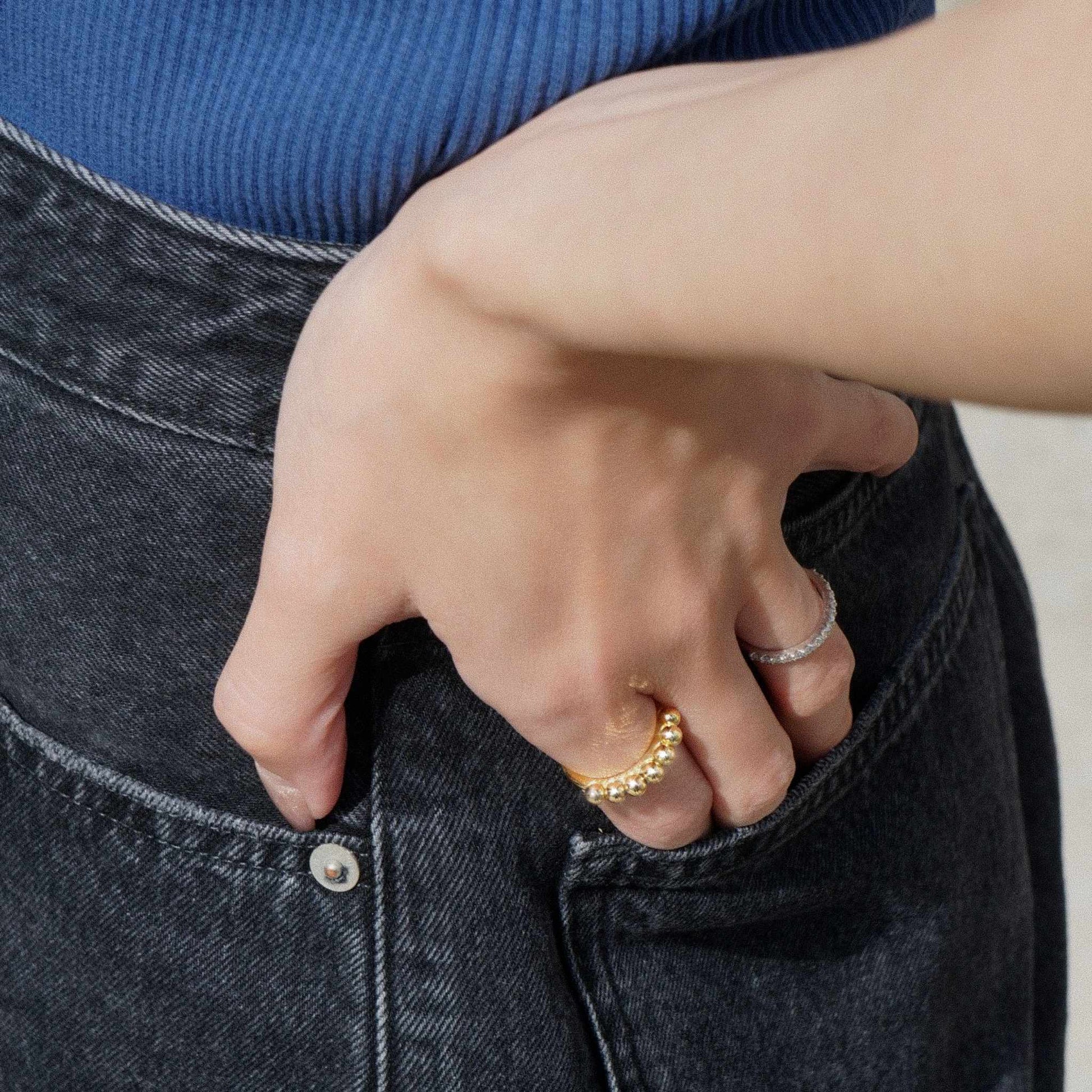 彫刻から着想を得て、ベビーパールリングの本来ならばパールである部分も金属で仕上げ、より日常で使いやすいようにアップデート。