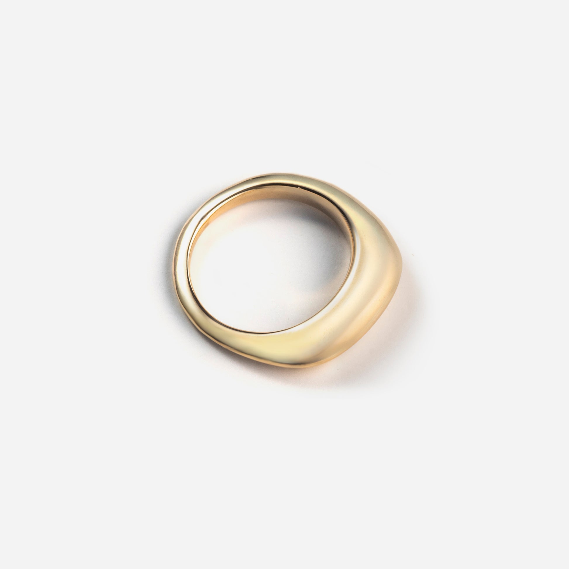 地金の厚みをテーパードさせることで、左右非対称にし、見える角度で華奢だったり、重厚感のある印象に変わるリングです。