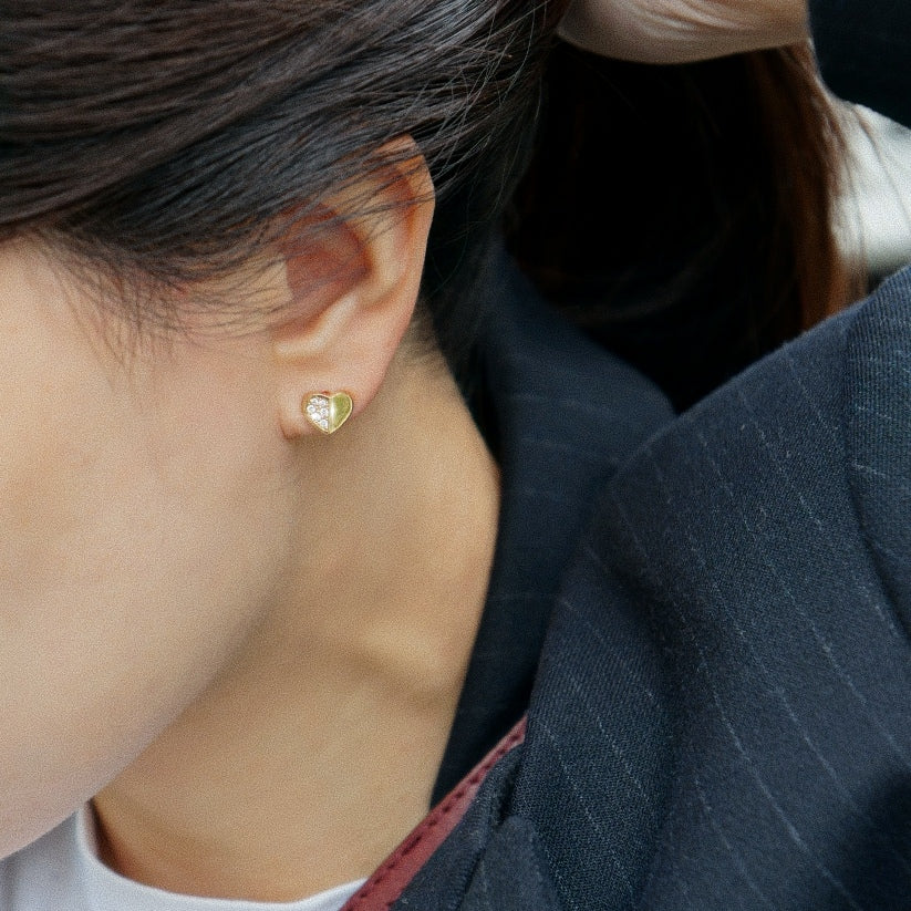 美しく磨かれた地金の面と、贅沢にセッティングされたダイヤモンド面。ハートという甘いモチーフでありながらも、年齢を重ねても使用しつづけていただけることを重視してデザインされています。