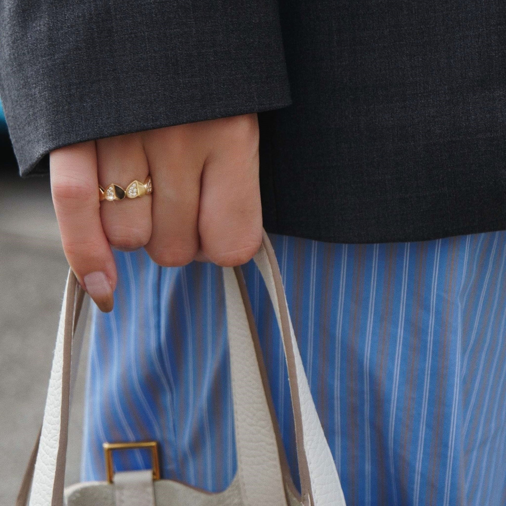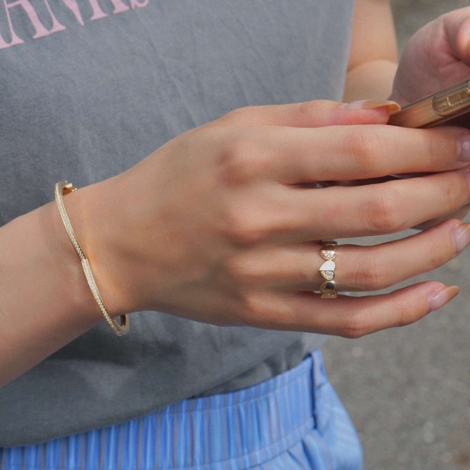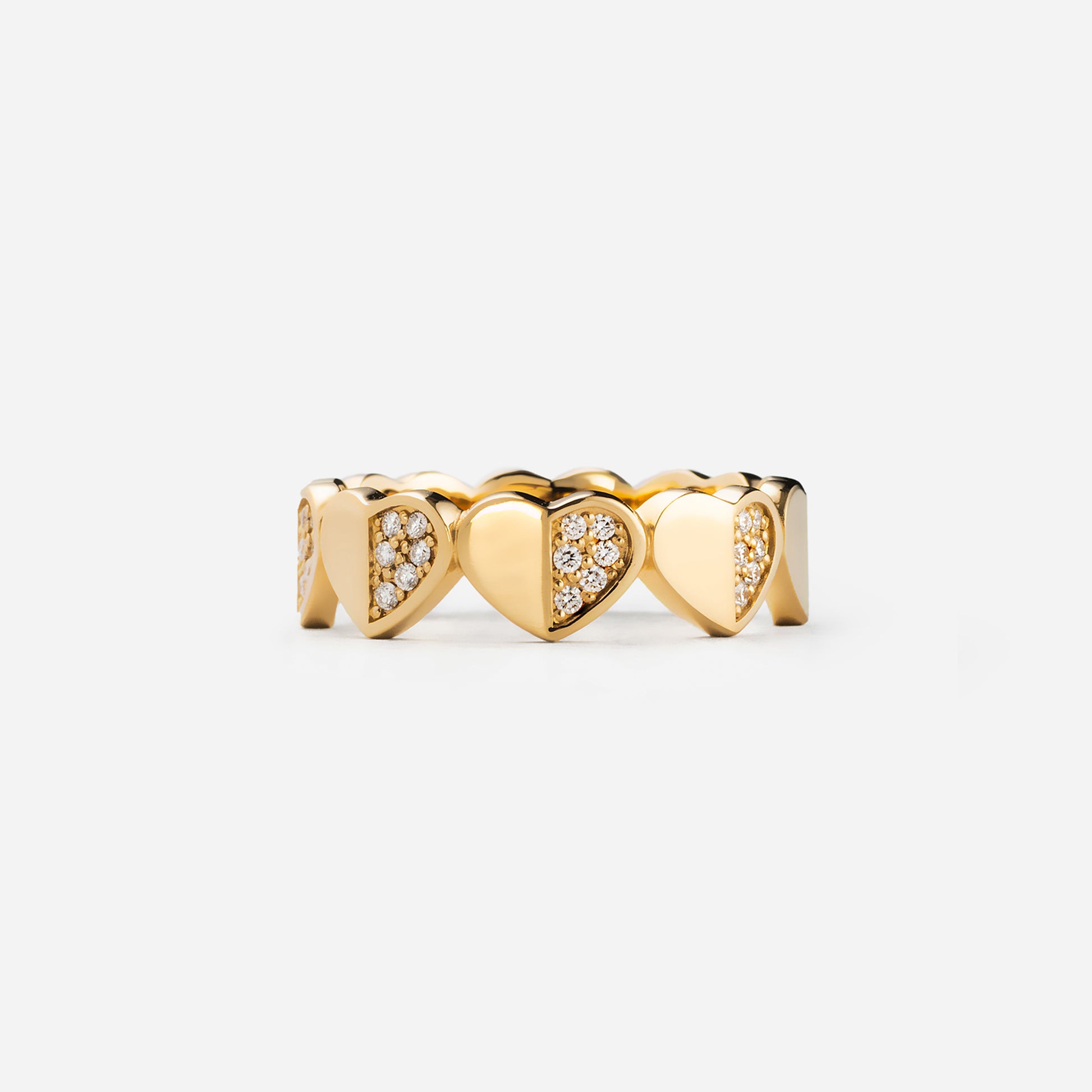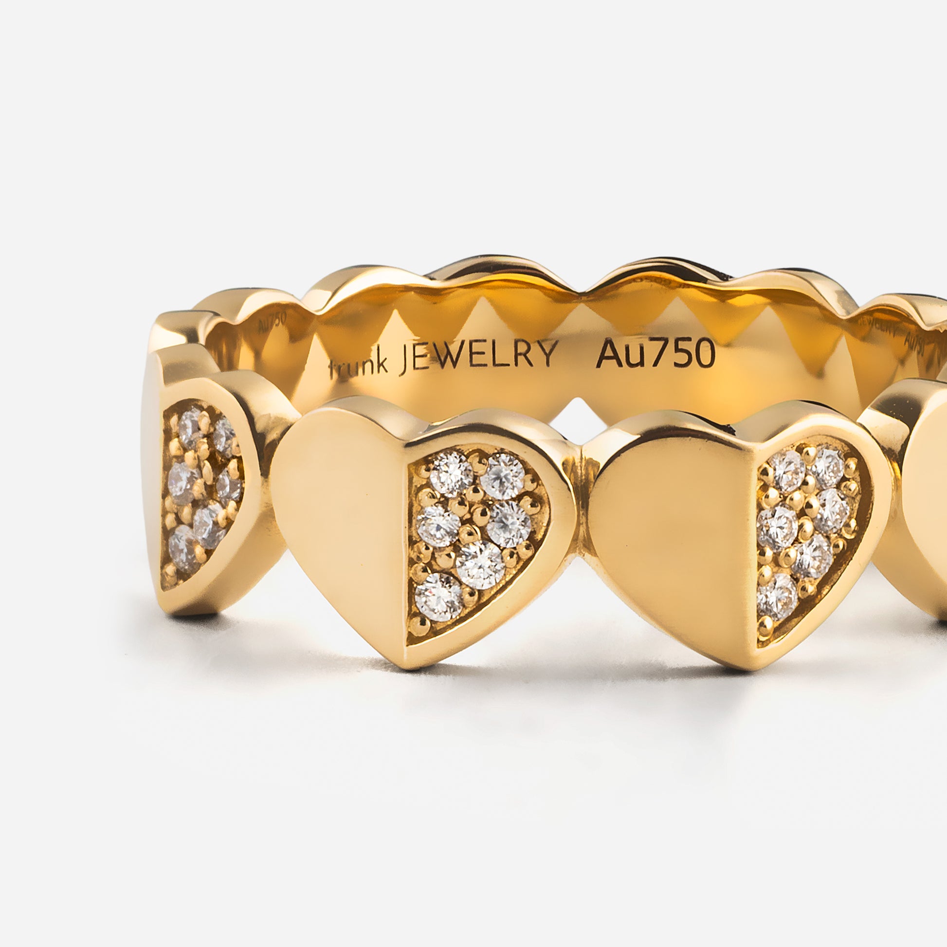 美しく磨かれた地金の面と、贅沢にセッティングされたダイヤモンド面。ハートという甘いモチーフでありながらも、年齢を重ねても使用しつづけていただけることを重視してデザインされています。