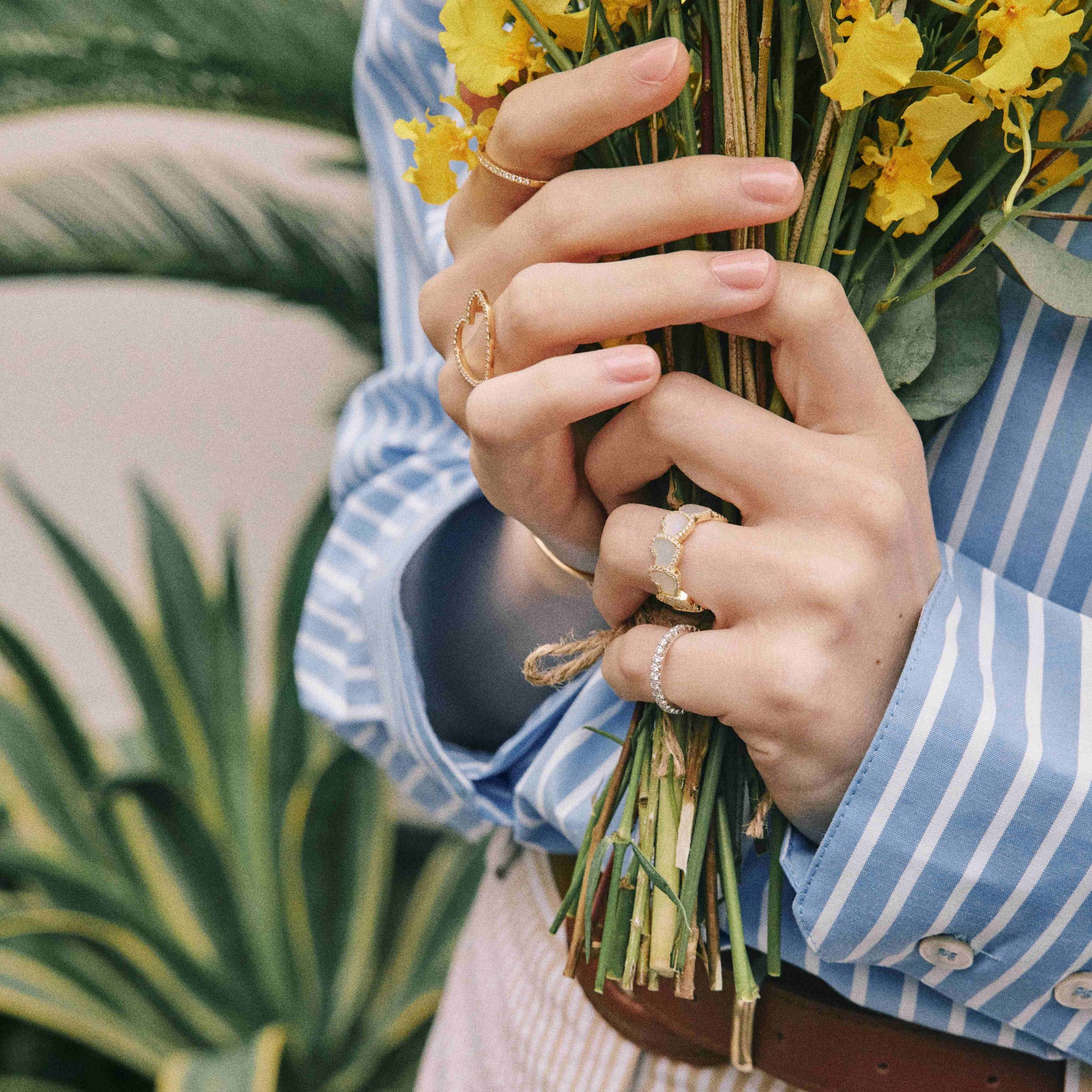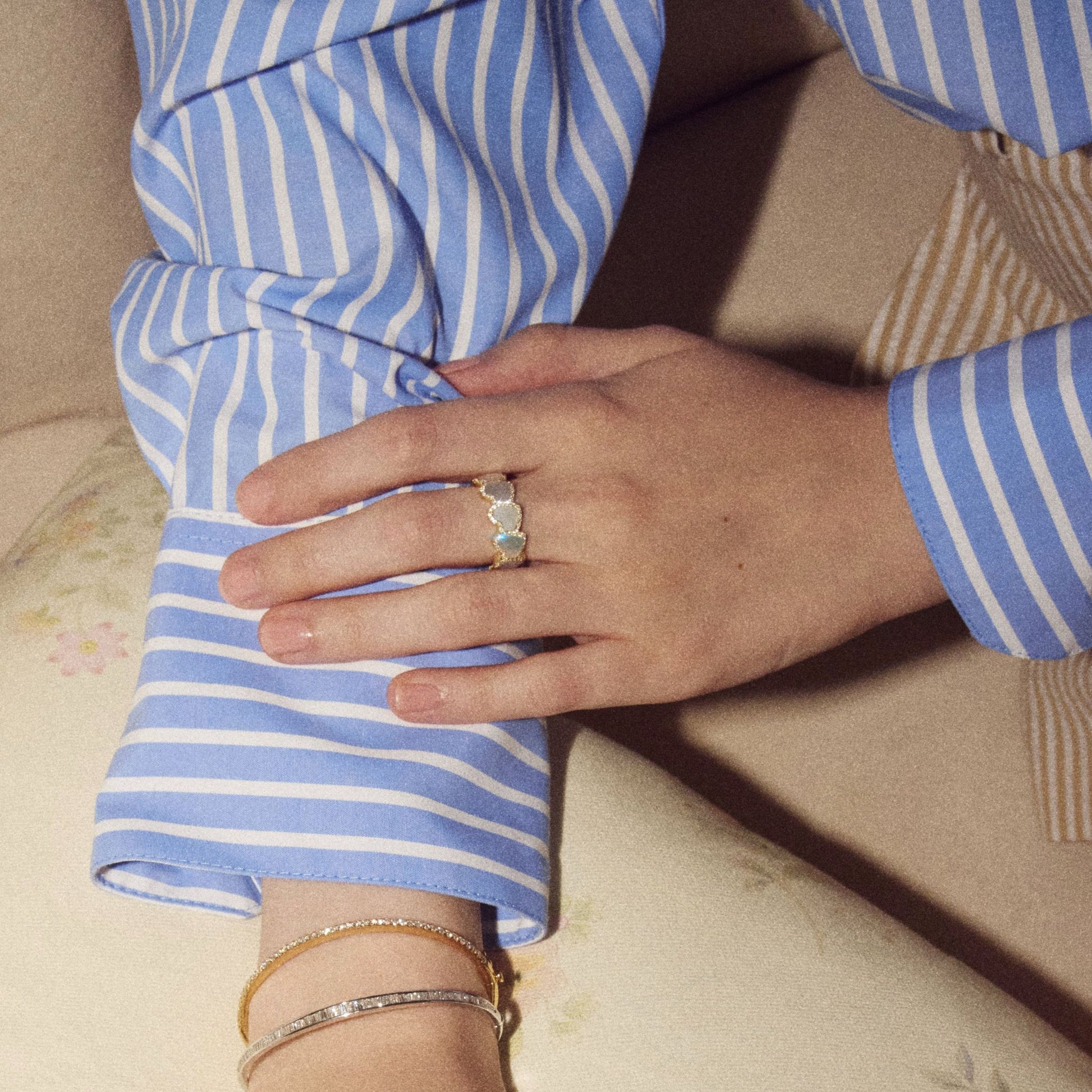 ピンクやグリーンなどの干渉色を含むパールカラーのマザーオブパールを地金に面一ではめ込み、その周囲を繊細なダイヤモンドが縁取ります。