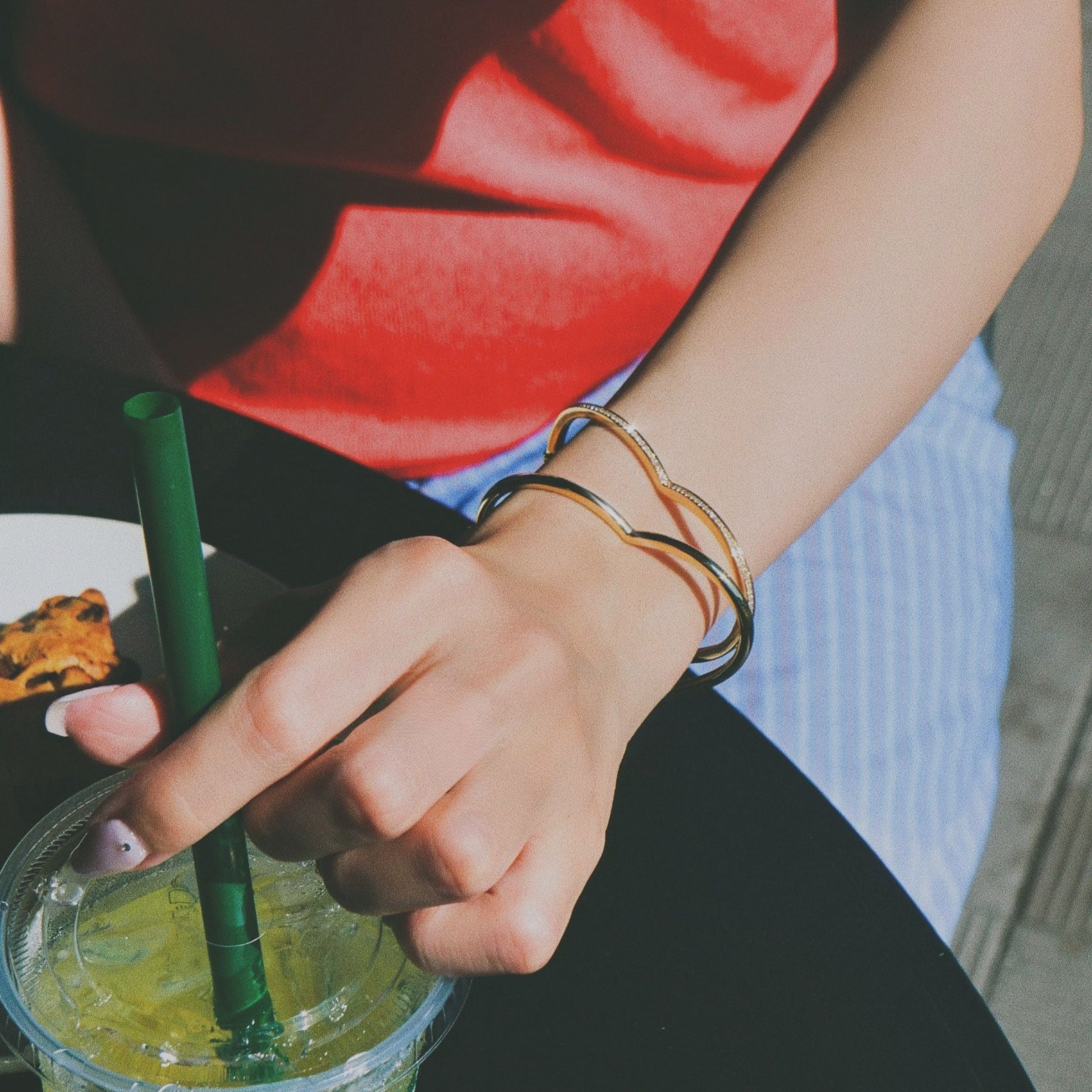 線形には丸みのあるふっくらとしたフォルムを採用し、肌あたりの良さと柔らかな印象を両立。バングル全体に流れる曲線が、まるで手首に寄り添うような美しさを描きます。